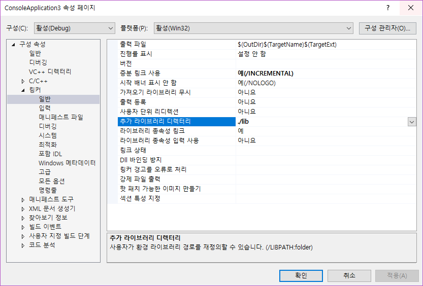 아까와 마찬가지로 프로젝트 이름을 우클릭하여 속성에 들어가 다음과 같은 세팅을 한다.