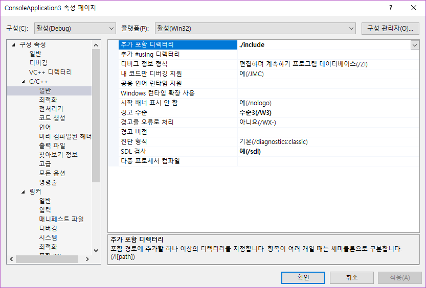 아까와 마찬가지로 프로젝트 이름을 우클릭하여 속성에 들어가 다음과 같은 세팅을 한다.