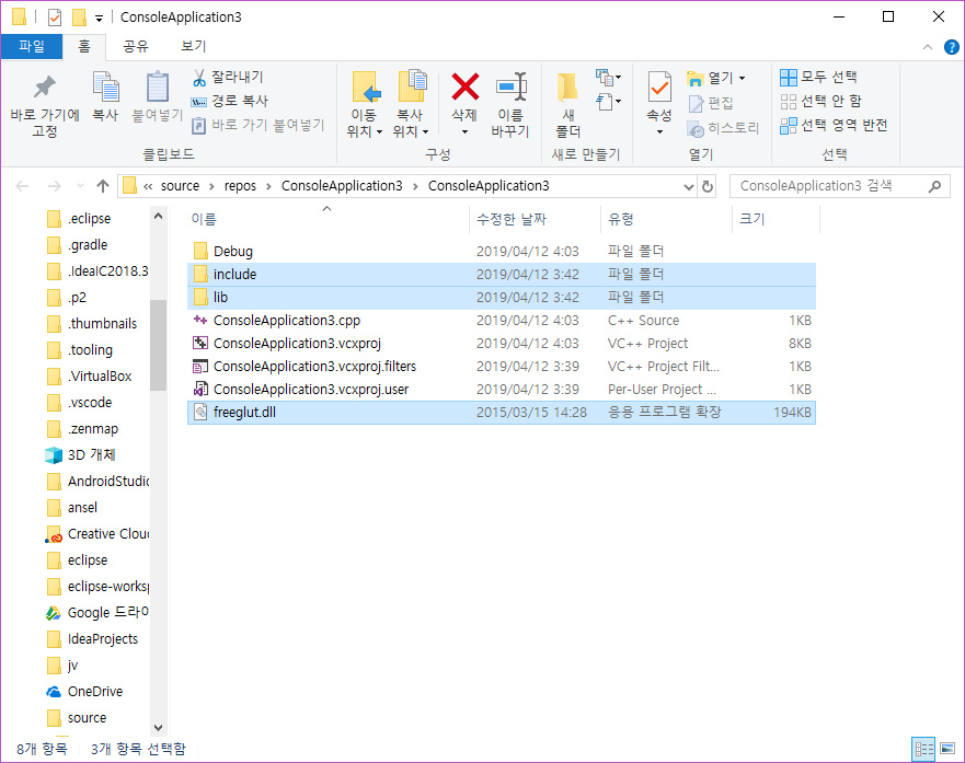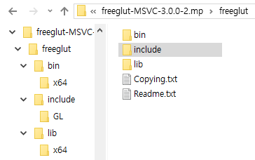 필요한 것은, include 폴더, lib 폴더 그리고 bin 폴더 안에 있는 freeglut.dll 파일이다.