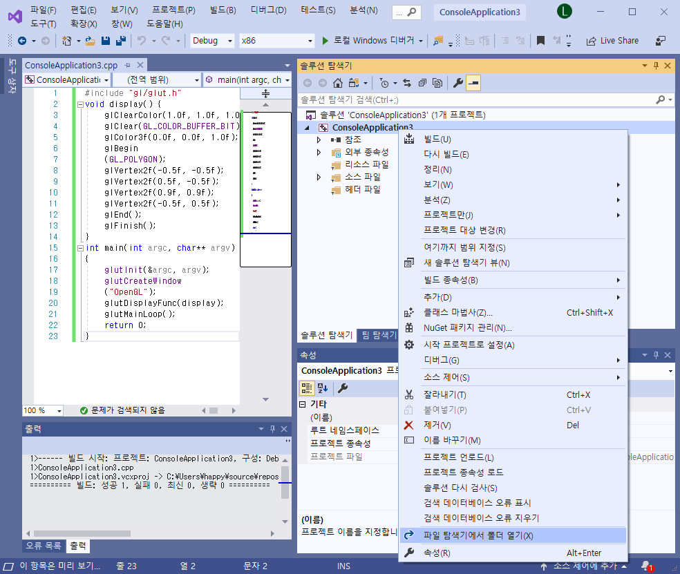프로젝트 생성은 C++ 콘솔 어플리케이션으로 시작한다. 프로젝트 생성이 완료되었다면 위에서 받아두었던 파일을 프로젝트 폴더로 옮겨준다. 솔루션 탐색기의 프로젝트명의 우클릭으로 파일탐색기에서 폴더열기를 할 수 있다.