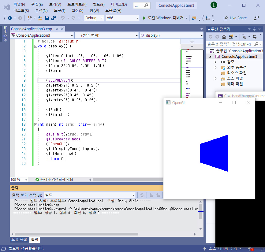 glEnd(); glFinish(); } int main(int argc, char** argv) { glutInit(&argc, argv); glutCreateWindow ("OpenGL"); glutDisplayFunc(display); glutMainLoop(); return 0; } |