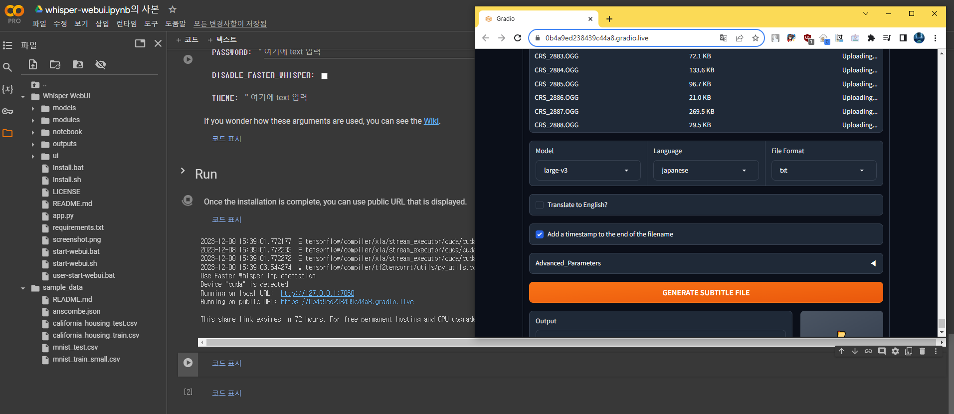 일단 제대로 대본이 나온다는 것은 확인되었고, 야수의 심장으로 WebUI에 3천개 가량의 파일을 한번에 드래그 해 놓았다. 업로드를 기다리는 중이다. 업로드가 끝나면 Generate 버튼을 눌러 대본을 생성하는데, 코랩 노트북 페이지의 파일시스템 중 outputs 폴더에 대본이 생성된다. 왠지 전체선택 다운로드라는 선택지는 없어보였기 때문에 3천개의 대본을 압축 후, 다운로드 받을것이다.