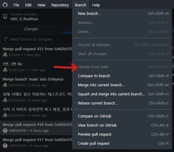 Github와 Github Desktop 사용이 아직 미숙하다. main 브런치에 merge를 끝낸 팀원이 작업한 내용을 내 브런치로 가져오는 기능을 오늘에서야 발견하였다. 그리고 Conflict가 난 부분을 어제는 제대로 해결하지 못하고 결국 스크립트파일을 새로 작성하기도 했었는데, 오늘은 제대로 Atom Browser를(왜인지는 모르겠지만 기본 브라우저로 Atom이 설정되어 있었다) 열어 필요한 코드만을 남기고 저장 및 종료하여 Conflict를 해결하였다.