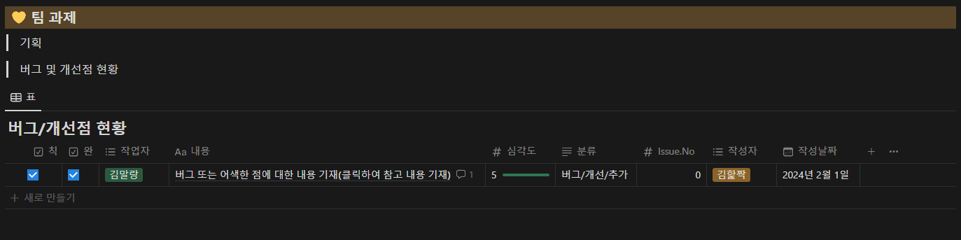 - 프로젝트 중 버그나 개선할 점 또는 추가하고 싶은 아이디어를 작성하는 데이터베이스
