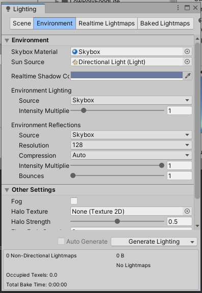 Window - Rendering - lighting의 Environment 탭에서 Skybox Material에 위에서 만든 Skybox를 사용