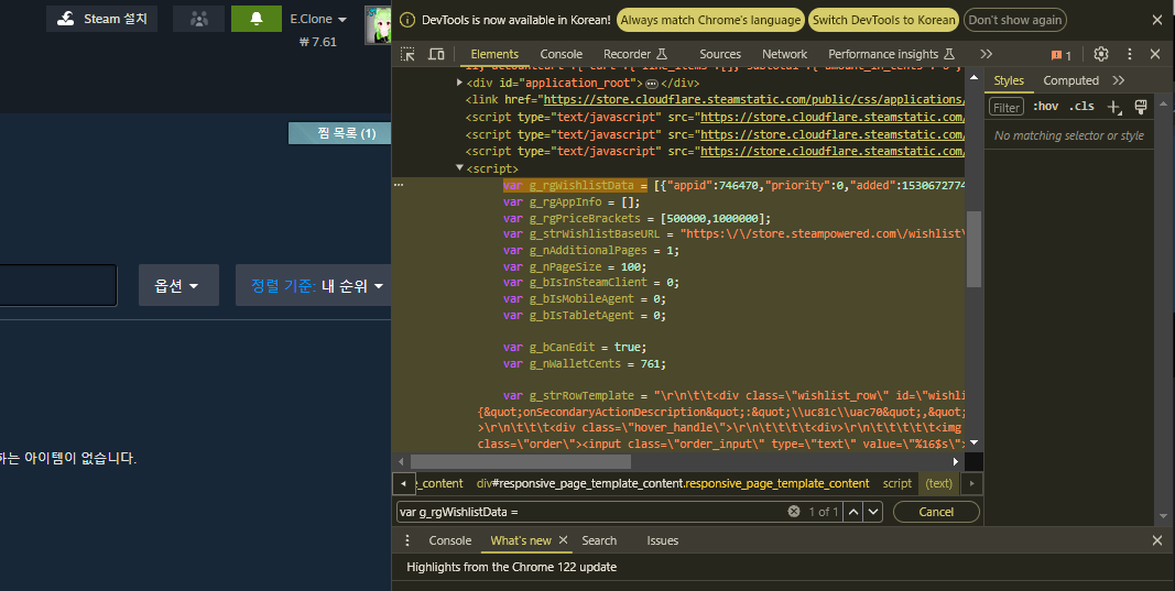 크롬 등의 브라우저로 스팀에 접속하여, 찜 목록에 들어가 F12를 눌러 개발자도구를 연다.