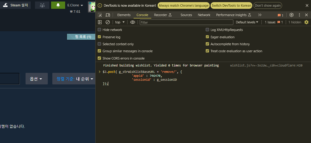 크롬 등의 브라우저로 스팀에 접속하여, 찜 목록에 들어가 F12를 눌러 개발자도구를 연다.
