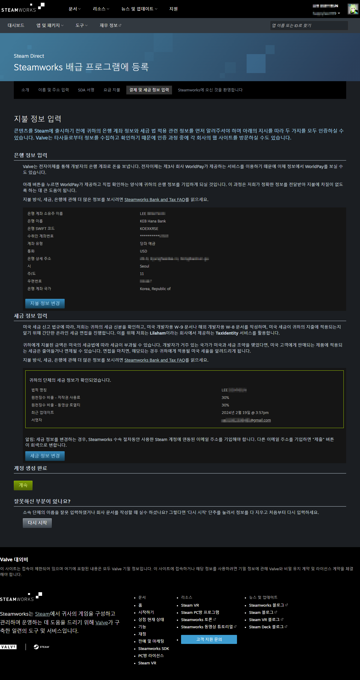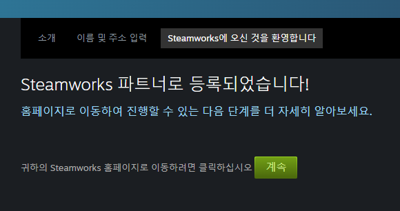이어서 '계속' 버튼을 눌러보니, 스팀 파트너 등록이 되었다는 메시지를 볼 수 있었다.