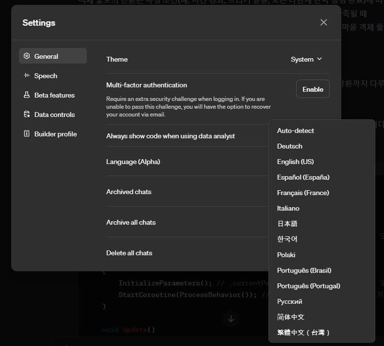 - ChatGPT 설정을 열어 언어설정을 English(US)로 전환