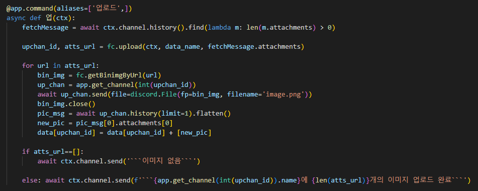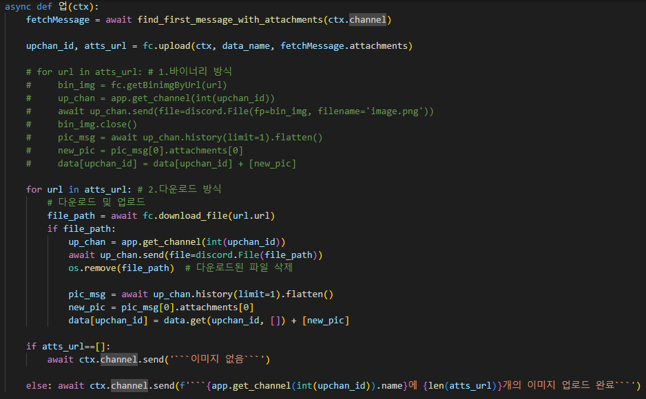 예전에는 업로드된 이미지를 다운로드 받아, 그 파일을 다시 첨부하여 앨범 채널에 전송했는데, 배포 서비스에서 파일 다운로드를 지원하지 않을 것을 가정하고(예: 깃허브) 바이너리 분석 및 그대로 업로드를 하도록 바꿨었다.