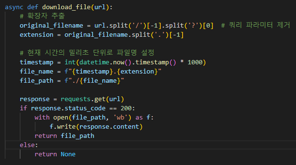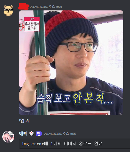 예전에는 업로드된 이미지를 다운로드 받아, 그 파일을 다시 첨부하여 앨범 채널에 전송했는데, 배포 서비스에서 파일 다운로드를 지원하지 않을 것을 가정하고(예: 깃허브) 바이너리 분석 및 그대로 업로드를 하도록 바꿨었다.