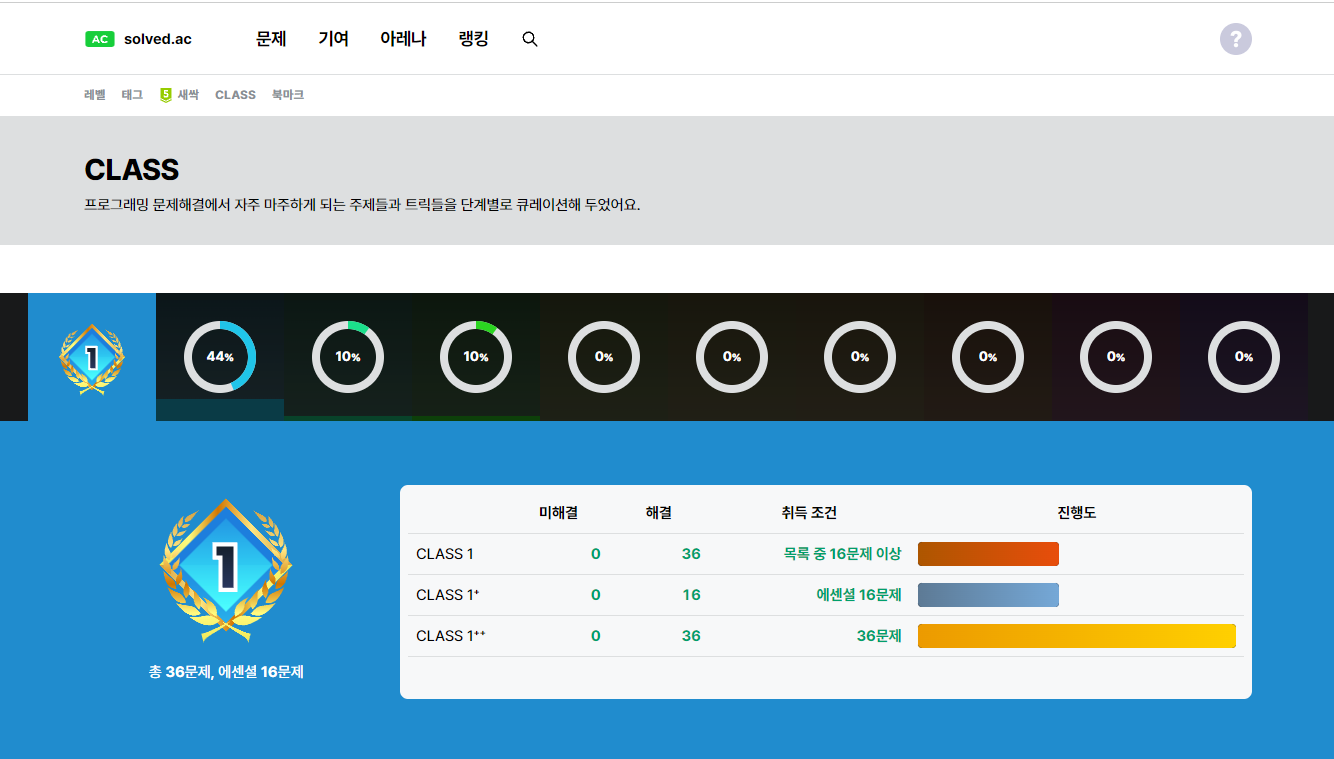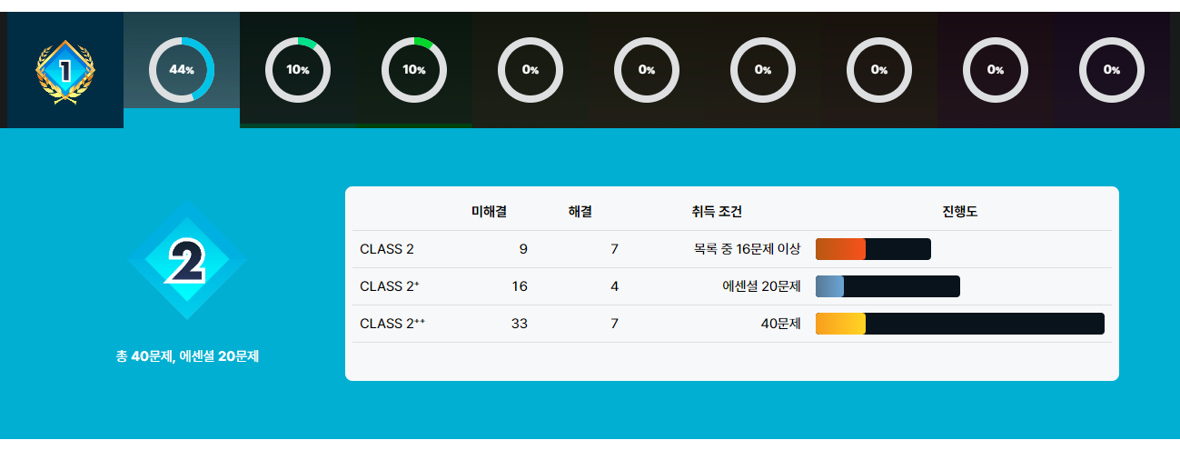 해당하는 클래스 별로 주어진 문제들을 해결하면 진행도가 오르는 컨텐츠가 있길래 일단 Class1 문제 모두 해결