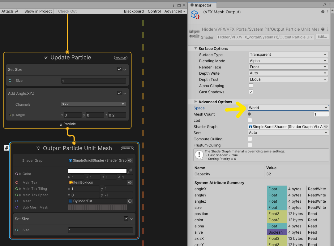 노란색 화살표로 표시 한 'Space' 속성을 Local 에서 World로 바꾸었더니, 잠깐의 로딩 후 Surface Options 카테고리가 보이기 시작했다.